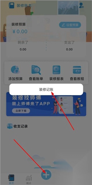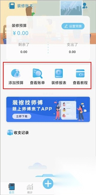 1. 打开装修记账本后,在首页能够进行装修预算的添加操作,同时也可以查看账单和收支记录。