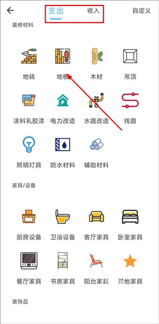 3、记账页面分为支出和收入两部分,需选择支出页面下的材料类别。
