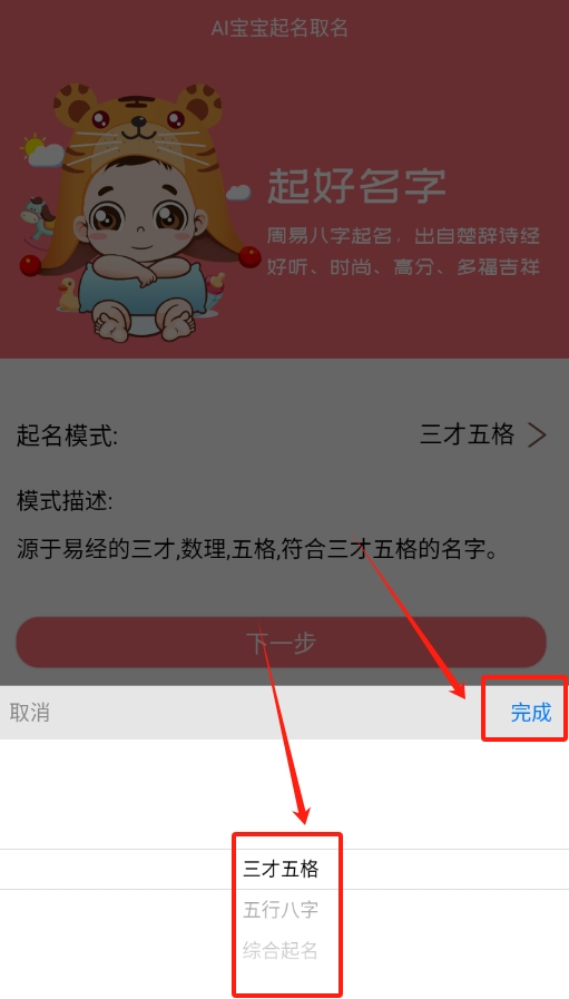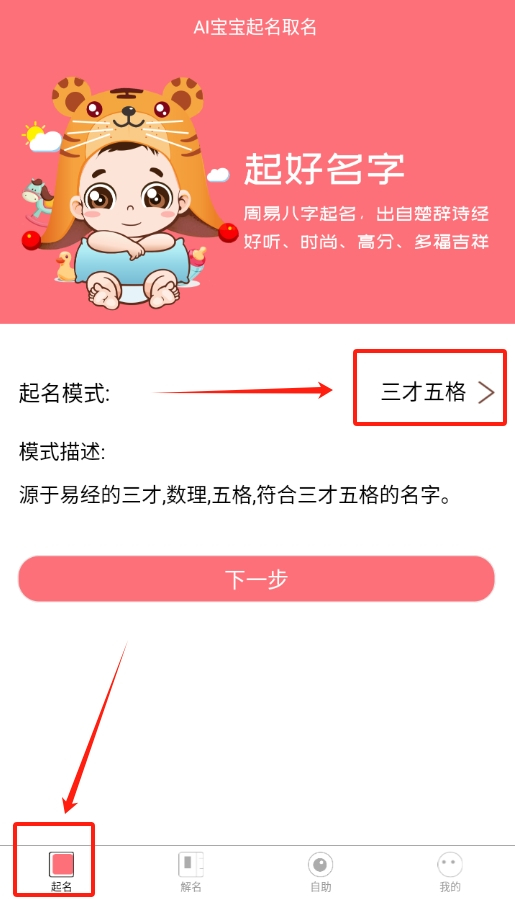 1启动这款取名应用后,进入主界面便能看到醒目的“取名模式”选项,直接点击即可。