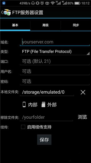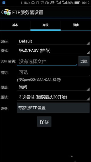 1首先启动AndFTP应用,进入主界面后,找到界面上方的加号按钮并点击,开始添加新的连接配置。在配置项中依次填写你的域名信息,选择连接类型(此处以sftp为例),输入对应的账号和密码,其他默认设置暂时保持不变,最后点击高级选项进行后续操作。