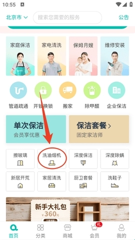 1、我们进入软件之后,可以根据自己的需要去找保洁服务,例如我现在想找一个保洁帮我洗一下油烟机。