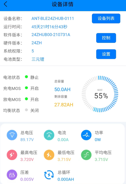 设备通过蓝牙直接连接后,可查看电池组中每个单体的电压数值、各单体间的电压差异、充电与放电时的功率数据以及电池已完成的循环使用次数等相关信息。