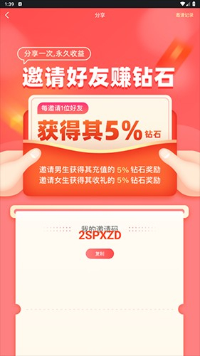 2、每邀请一位男生,就能获得该男生充值金额5%的钻石奖励;每邀请一位女生,则能获得该女生所收礼物对应价值5%的钻石奖励。