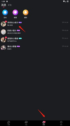 1启动应用程序后,找到界面底部的消息入口并点击,接着在消息列表中选择需要互动的对话窗口进入。