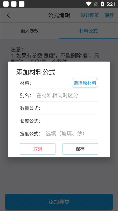 3、点击“添加种类”按钮,即可添加不同的原材料,并设置对应的长宽公式。