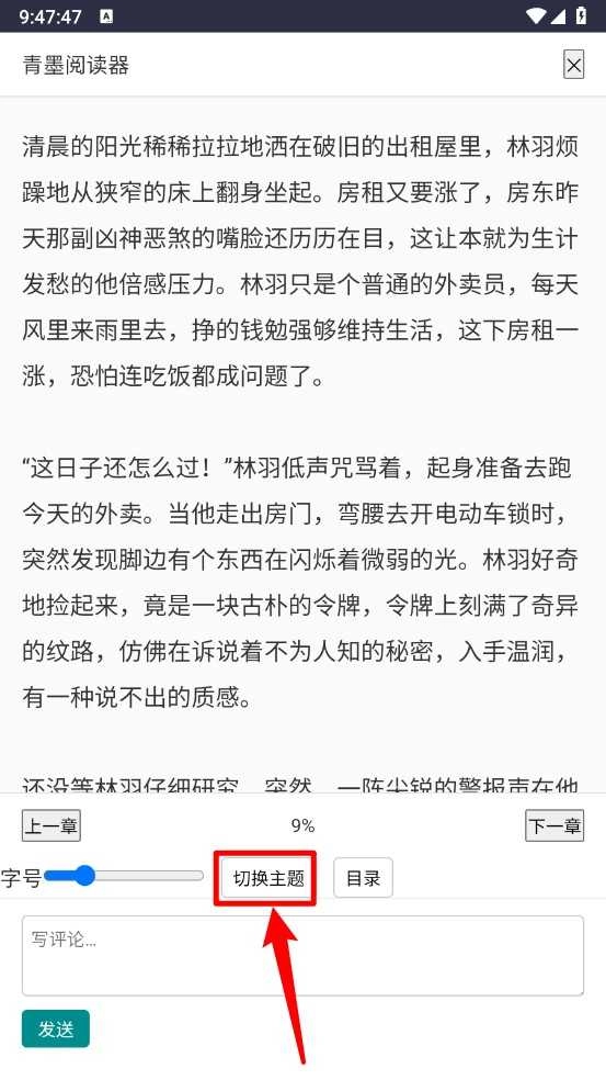 3、在阅读页面中,点击屏幕中央调出菜单,选择“切换主题”选项。