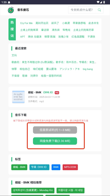 海量音乐资源库:涵盖全球各大音乐平台的资源,包括流行金曲、最新单曲、经典老歌和网络热门歌曲等多种类型,风格涉及流行、摇滚、古典、民谣、嘻哈、电子乐等,如《Cry Fo rMe》《离别开出花》《起风了》等热门歌曲均有收录,且提供无损格式音乐,保证音质。