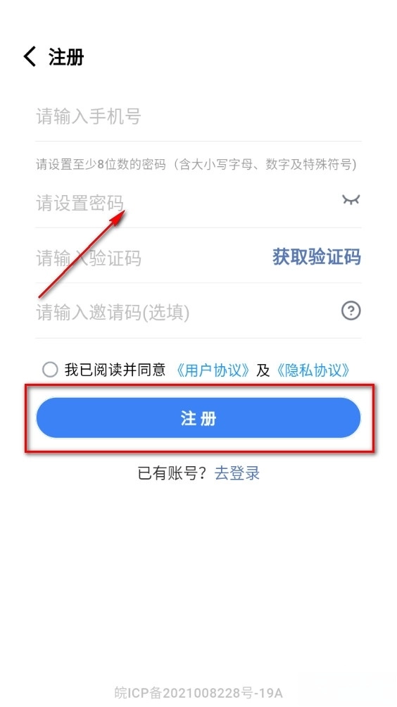 2、输入手机号,密码,获取验证码,点击注册