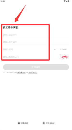 2在认证方式中挑选员工编号这一选项,随后录入企业的简短名称、对应的编号以及用于验证的相关信息。