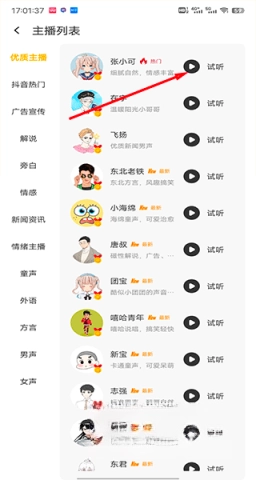 2、汇聚了多位热门主播声音,几十位情绪主播随时为您服务,可以满足不同场景下的配音要求。