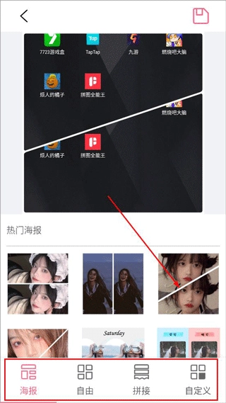 3、页面下方提供多种拼图模式,包括海报、自由、拼接、自定义,挑选喜欢的模板样式。