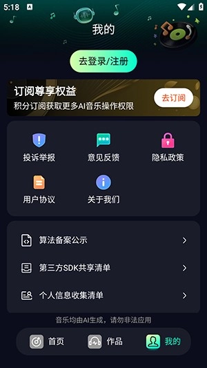 1、进入首页,根据你需要创作歌曲类型选择极简模式,情景模式,或者纯音乐。