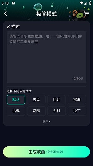 2、例如进入极简模式,就非常快捷,在文本框输入歌曲描述关键词,选择歌曲风格,然后点击下方生成歌曲就可以了。