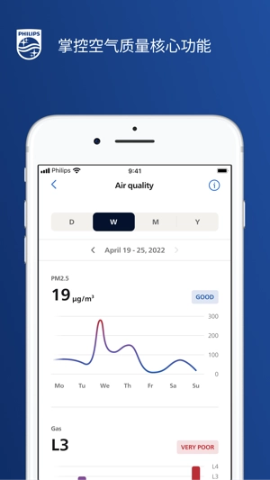 空气净化器测量的室内空气质量信息(包括历史概况)可在该应用程序中查看;跟踪室外空气质量和花粉情况,当污染级别较高时,您将收到警告。