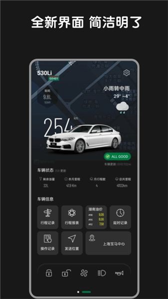 支持多种桌面小组件,小组件支持自定义样式;在小组件上可以查看车辆状态、胎压、停留时间、油耗、当前位置天气、油价,控制车辆通风,解锁,锁车,鸣笛,车灯等操作