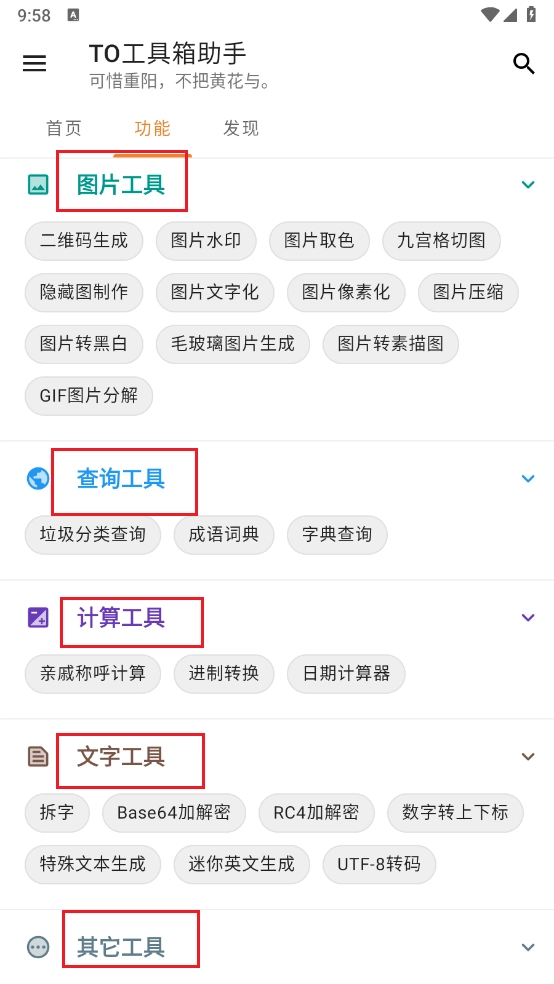 1、六大工具分类,涵盖日常、图片、查询、计算、文字等多种需求。