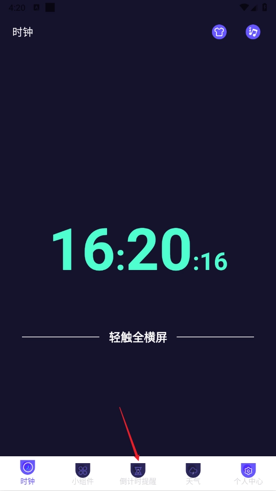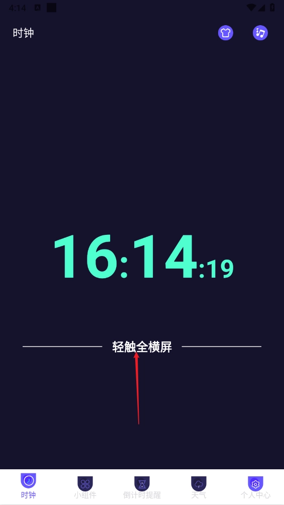 2、进入时钟板块后,轻触即可切换至全横屏模式,右上角支持自定义皮肤设置。