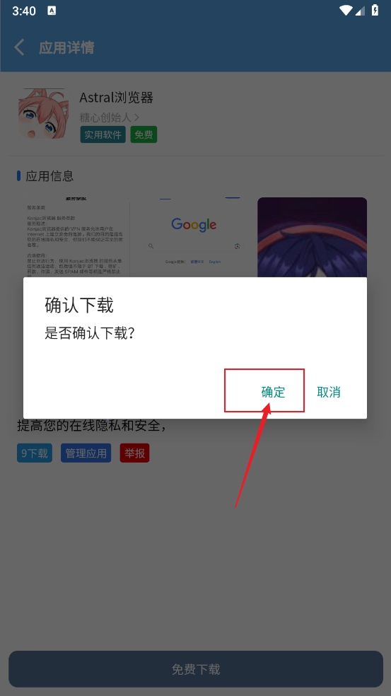 3、在应用详情页点击底部的"免费",如图。