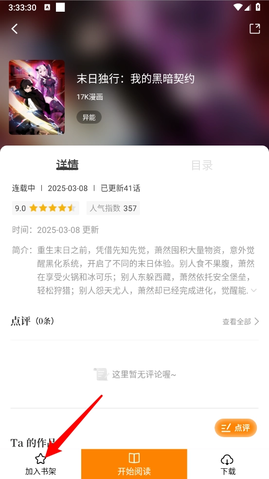 2、如图,在漫画详情页点击左下角"加入书架"。