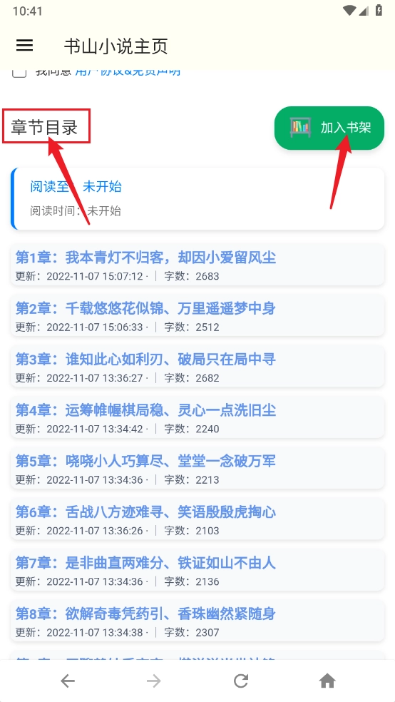 3、进入想详情页上滑即可查看章节目录和加入书架。