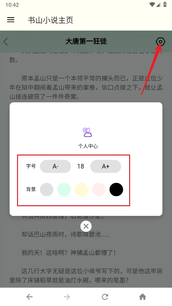 5、点击右上角的“设置”图标,可进行字号、背景相关设置。