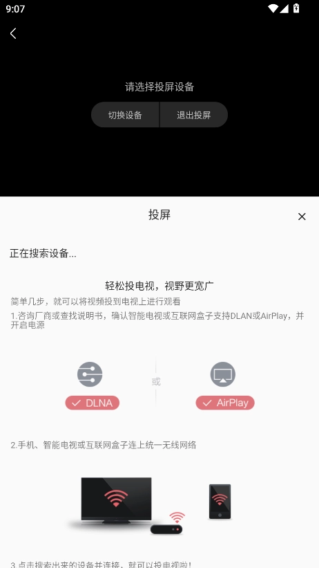 3、如图,进行搜索连接电视设备后即可开启投屏播放,手机和电视需要处于同一网络下。