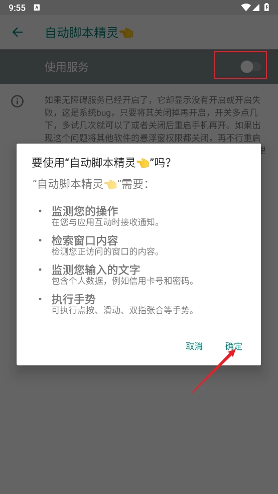 4、然后开启使用服务的开关,点击"确定"即可。