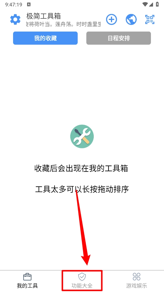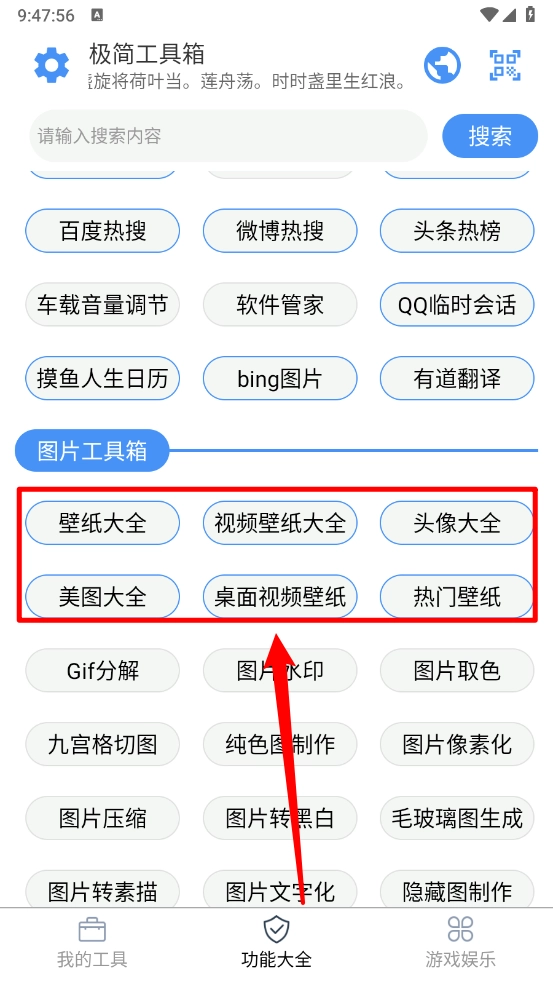 2、在主页点击"功能大全"。