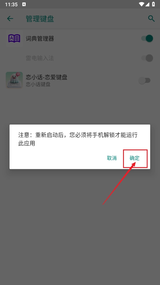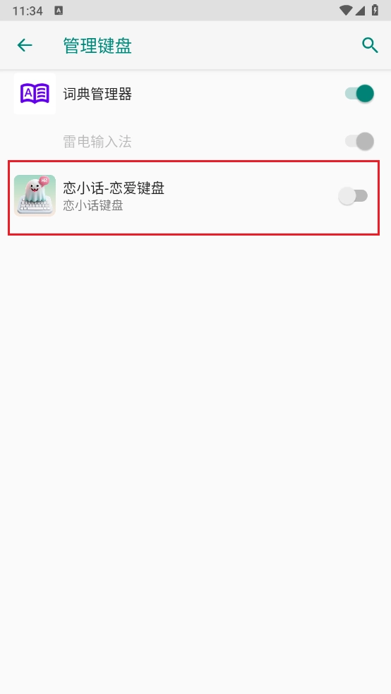 3、会自动跳转到管理键盘界面,点击“恋小话恋爱键盘”对应的开关按钮。