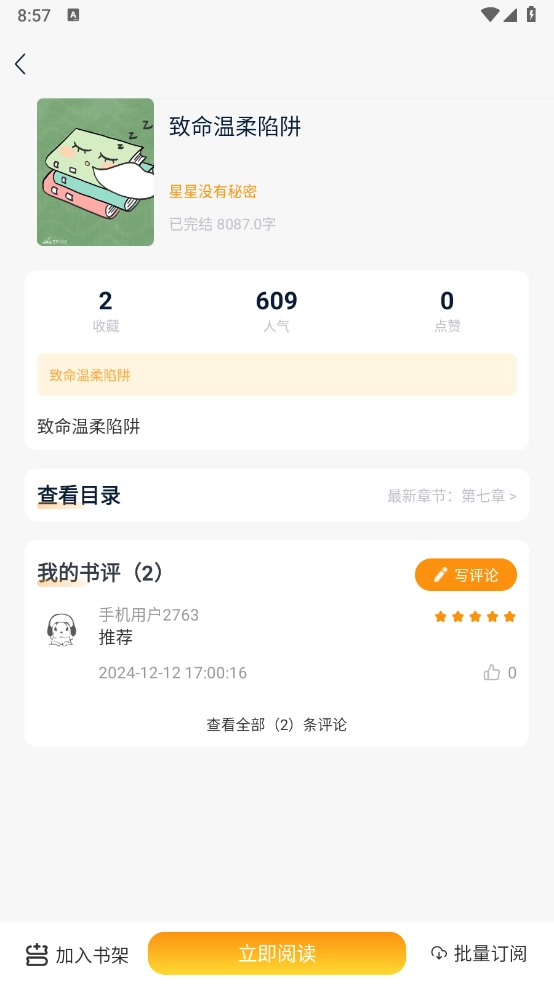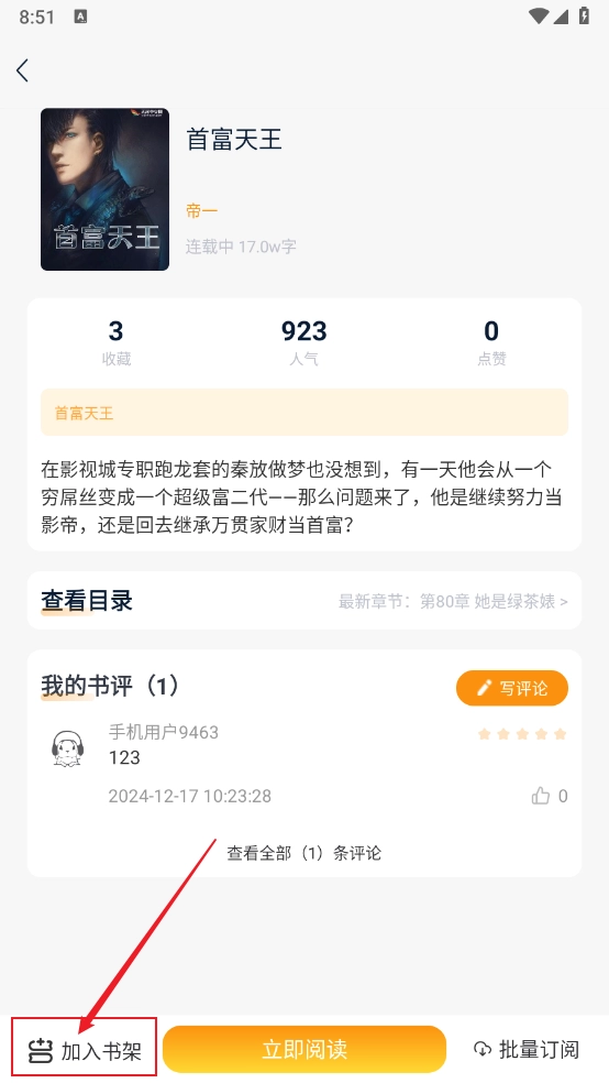 3、点击进入小说详情页,点击左下角的"加入书架"即可。