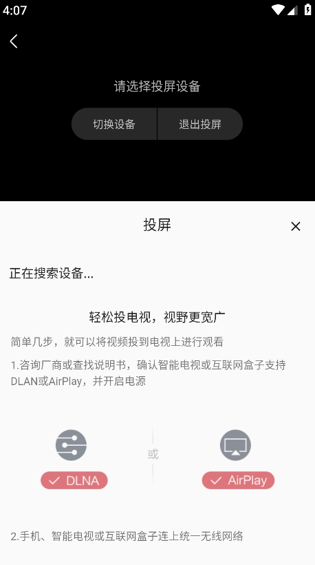 4、最后等待搜索结果出现并点击对应的投屏设备,就能开启投屏播放功能了,需要注意的是手机和投屏设备必须处于同一个网络环境下。