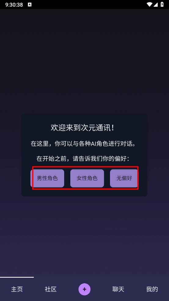 2、进入主页,根据所需选择角色偏好。
