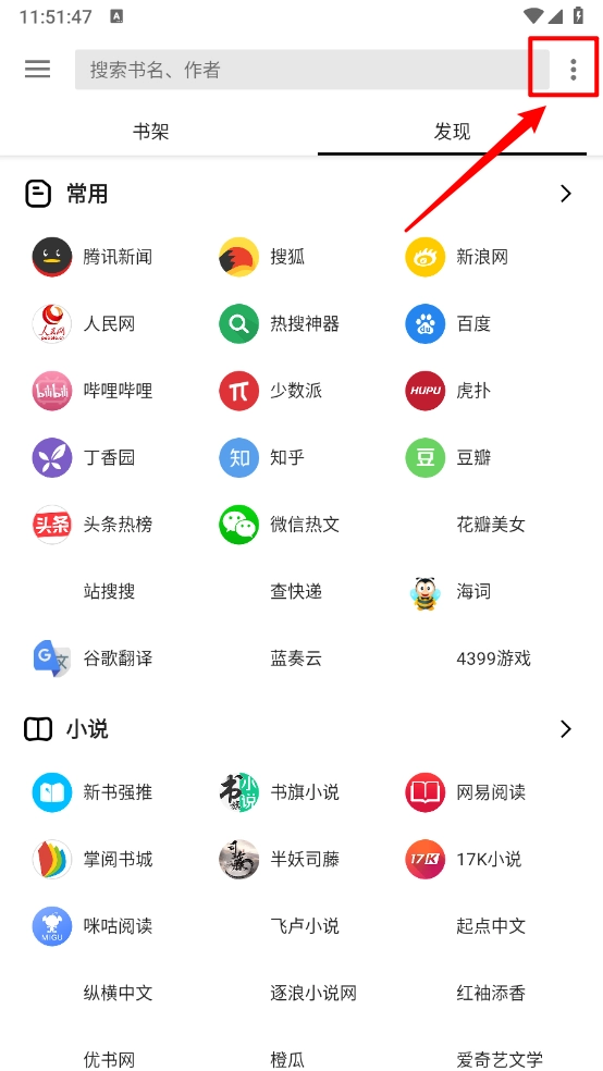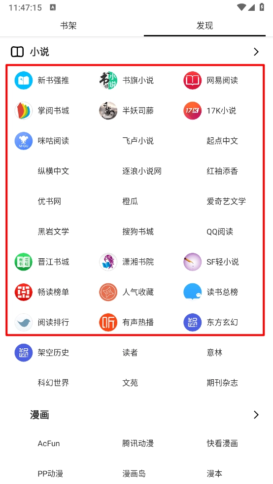 1、首先安装软件,进入“发现”页面,挑选自己喜欢的小说平台。