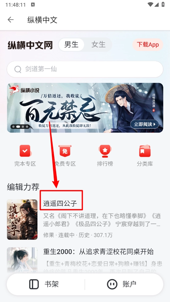 2、一键直达后,可在主页挑选喜爱的小说,也能点击顶部搜索框进行直接搜索。
