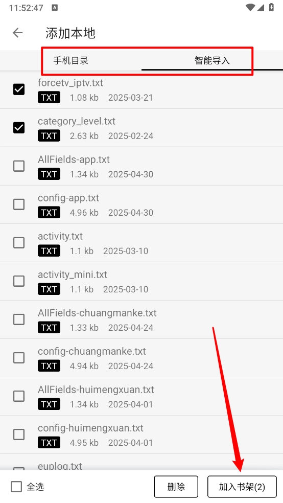 3、进入后可看到手机目录与智能导入功能,勾选想要导入的资源,点击右下角的“加入书架”按钮就完成了。