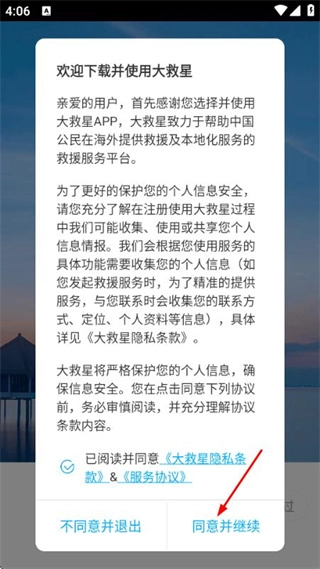 1、进入大救星在隐私条款弹窗中,勾选同意后点击同意并继续按钮,进入新用户注册页面。