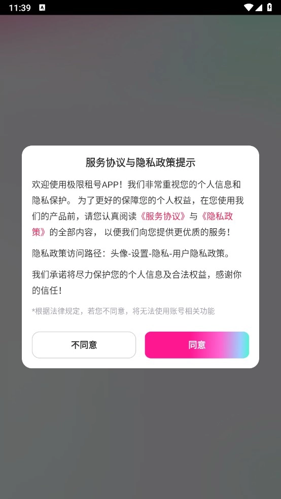 1、安装好极限租号,查看并同意相关的政策与协议。