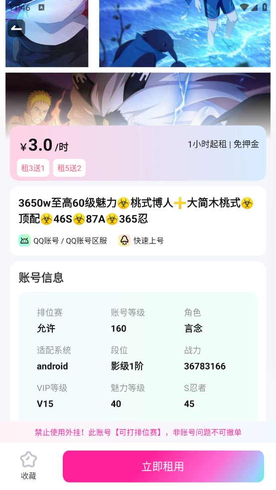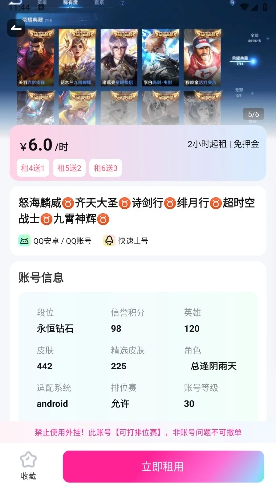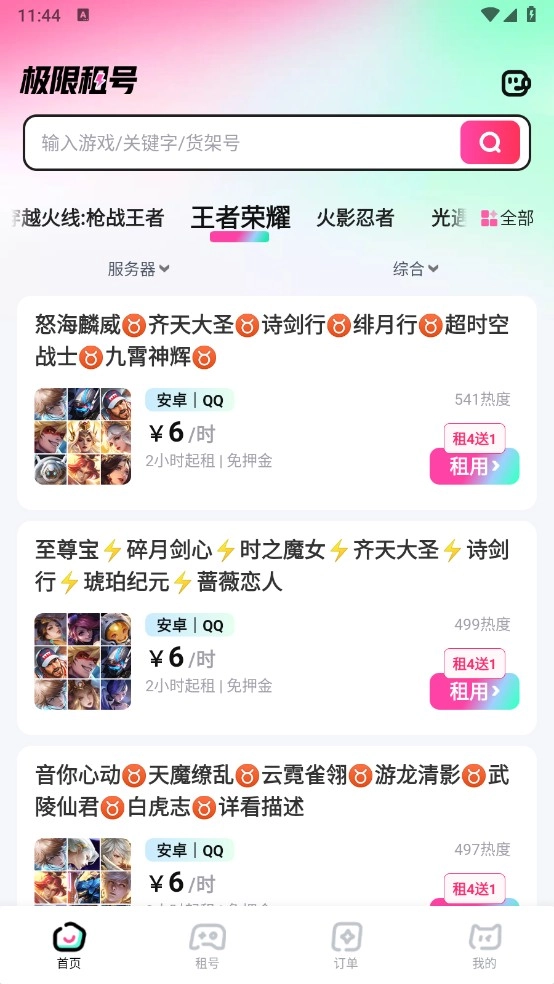 极限租号是一款十分专业的游戏账号租赁应用。在这里,用户能发现众多热门游戏的账号资源,像王者荣耀、和平精英、原神、光遇等都涵盖在内,每款游戏都提供了丰富的账号选择空间,用户可以慢慢挑选,找到最合心意的账号进行租赁。另外,所有账号的定价都清晰透明,而且价格相当实惠,用户能用很划算的价格租到品质不错的游戏账号。