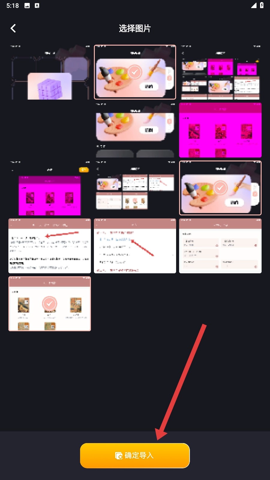 进入选择图片的页面后,挑选要拼接的图片,选好后点击底部的【确定导入】按钮,就能导入选中的图片了。