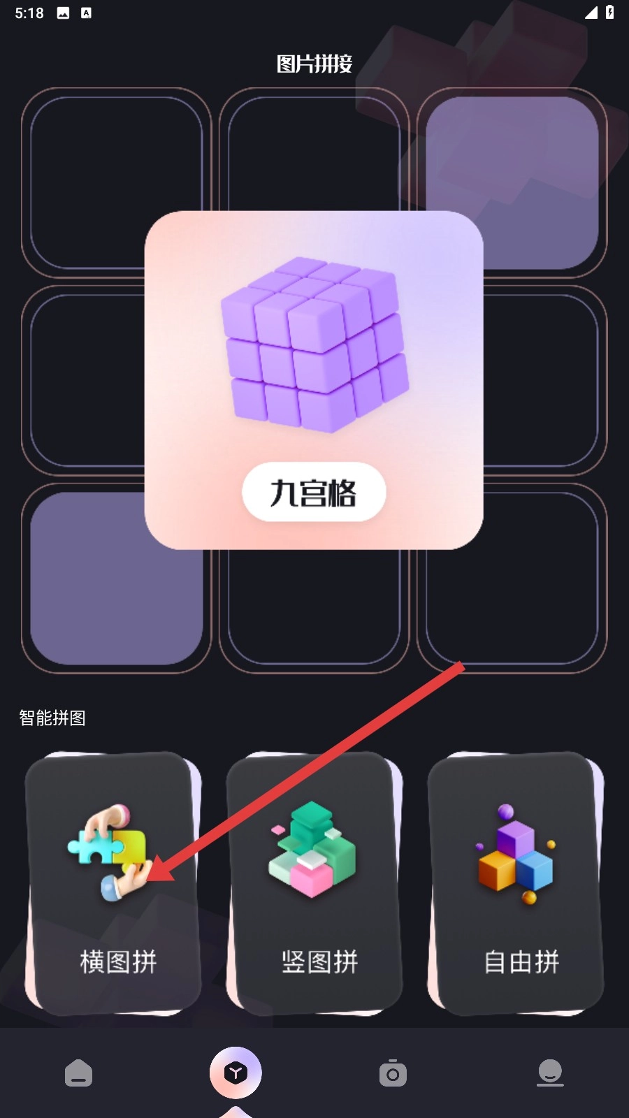 在图片拼接页面,可看到【九宫格】等样式,点击【智能拼图-横图拼】选项,选定横向拼接图片的方式。