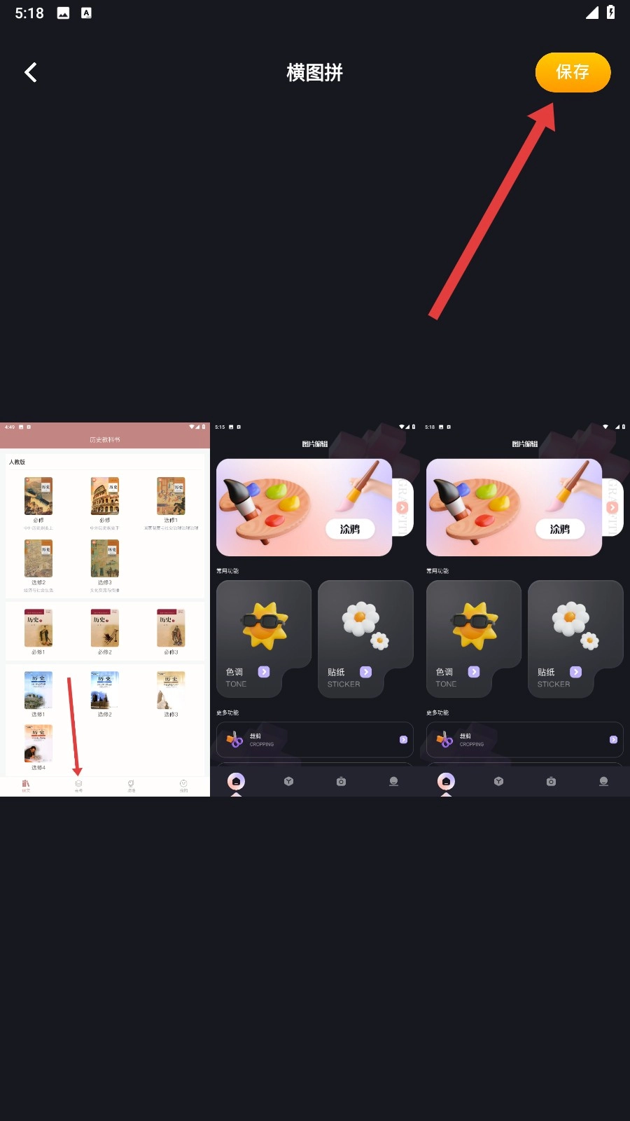 4、把图片按照横图拼的样式排列妥当后,点击页面右上角的【保存】按钮,就能将横向拼接完成的图片保存下来。