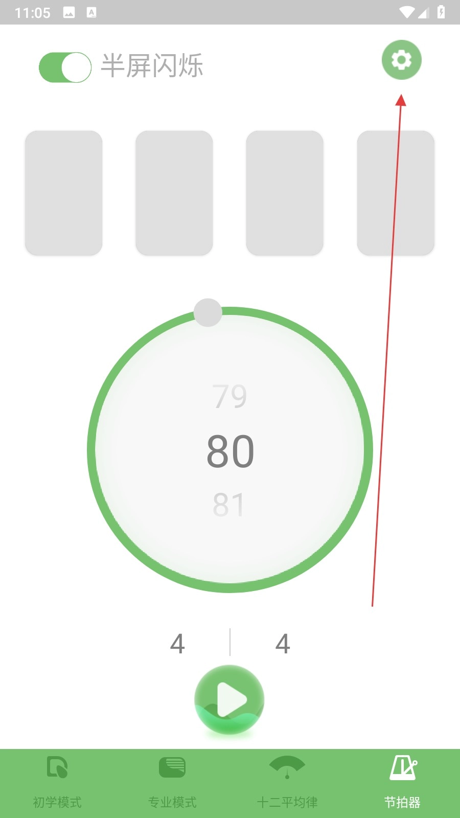 1、在节拍器界面,点击右上角的【设置】图标,进入设置页面。