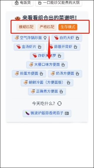 3、而所生成的菜谱也分为模糊、严格、生存三个模式
