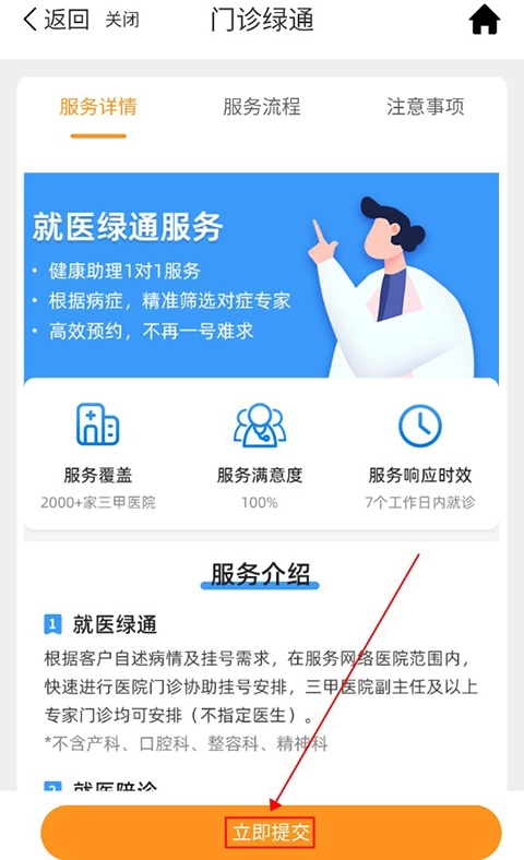 1、打开“首页”,进入“门诊绿通”板块,点击“立即提交”按钮。
