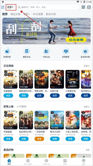 1、安装好万达影院(万达电影)后,可依据自身所在位置选择购票;系统默认会自动定位,若定位不成功,可手动选择,具体操作如图所示,点击右上角即可。