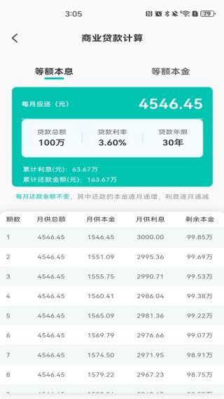 4. 商业贷款计算功能,可以按照等额本息还款和等额本金还款两种方式进行计算。