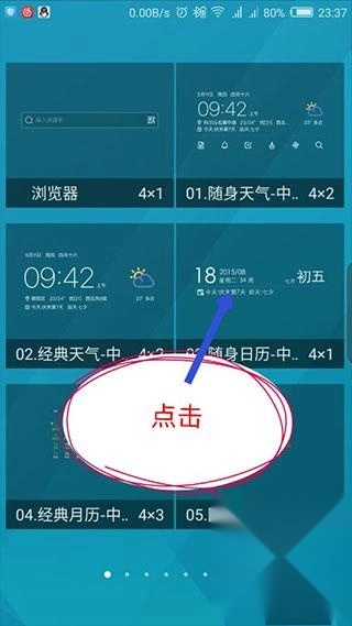 接着在打开的手机小部件界面里,找到想要添加的万年历插件,按照提示,进行拖拽插件或者点击插件的操作。