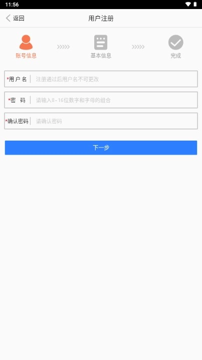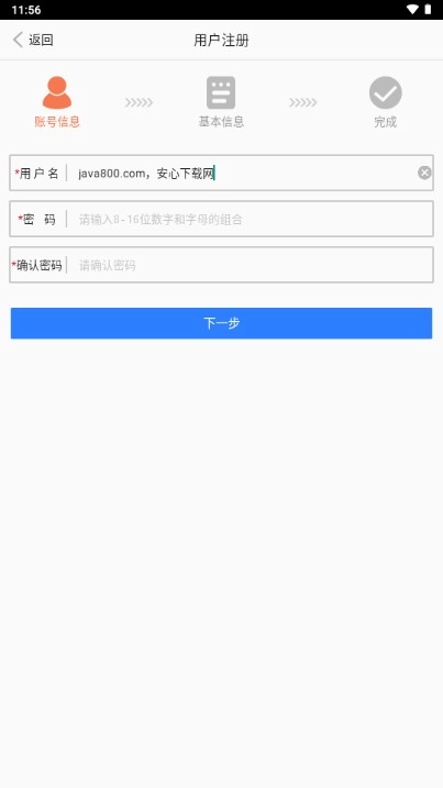 1、点击【注册账号】按钮,跳转至注册页面; 2、设置【用户名】与【密码】,并填写相关基本信息;