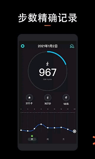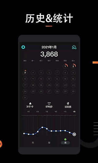 1、自动追踪热量消耗、行走步数与跑步里程,并生成每日、每周及每月的可视化数据统计图表。