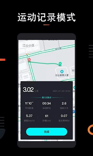 2、在跑步过程中实时记录运动距离、所用时间、行进轨迹与能量消耗,所有信息可安全存储于云端。